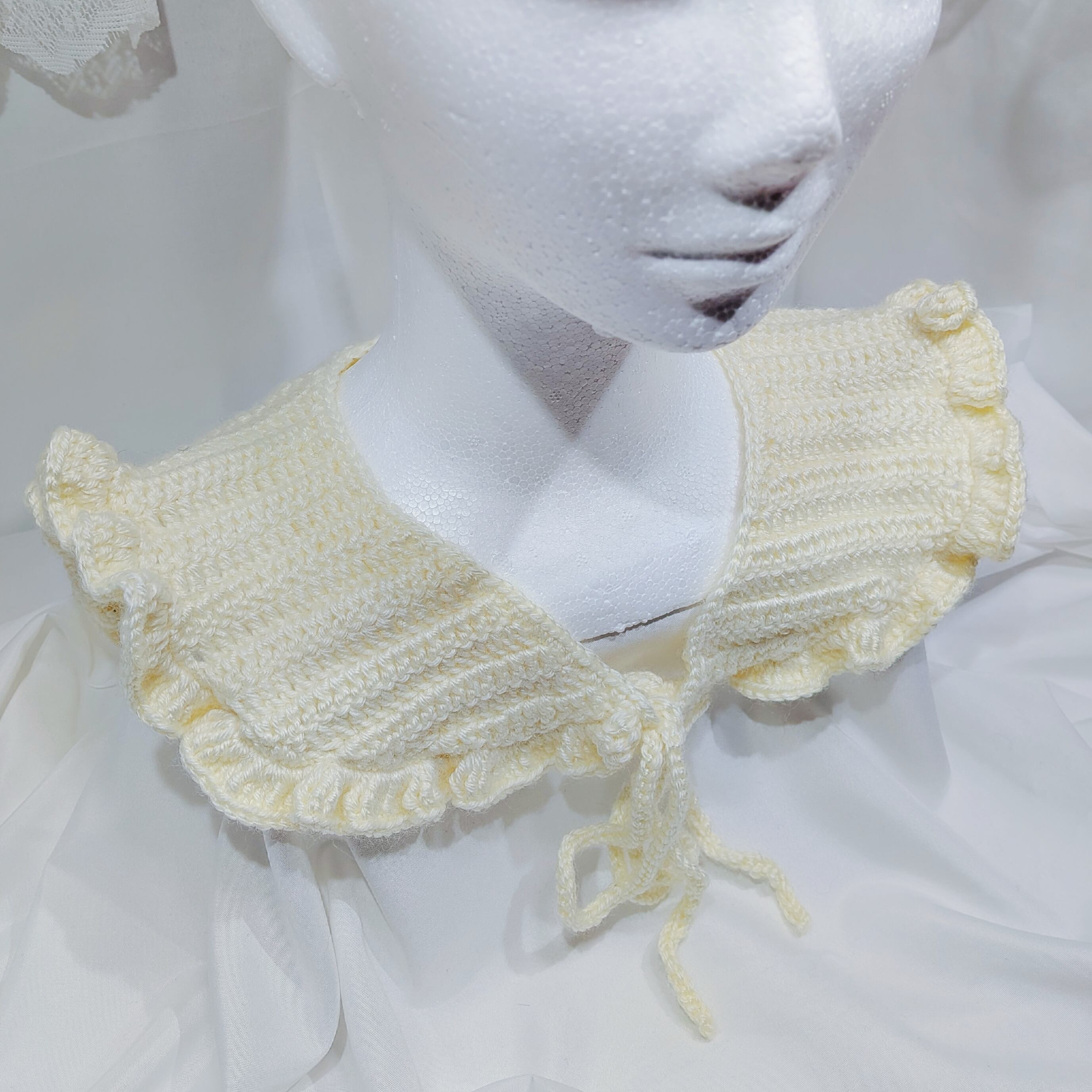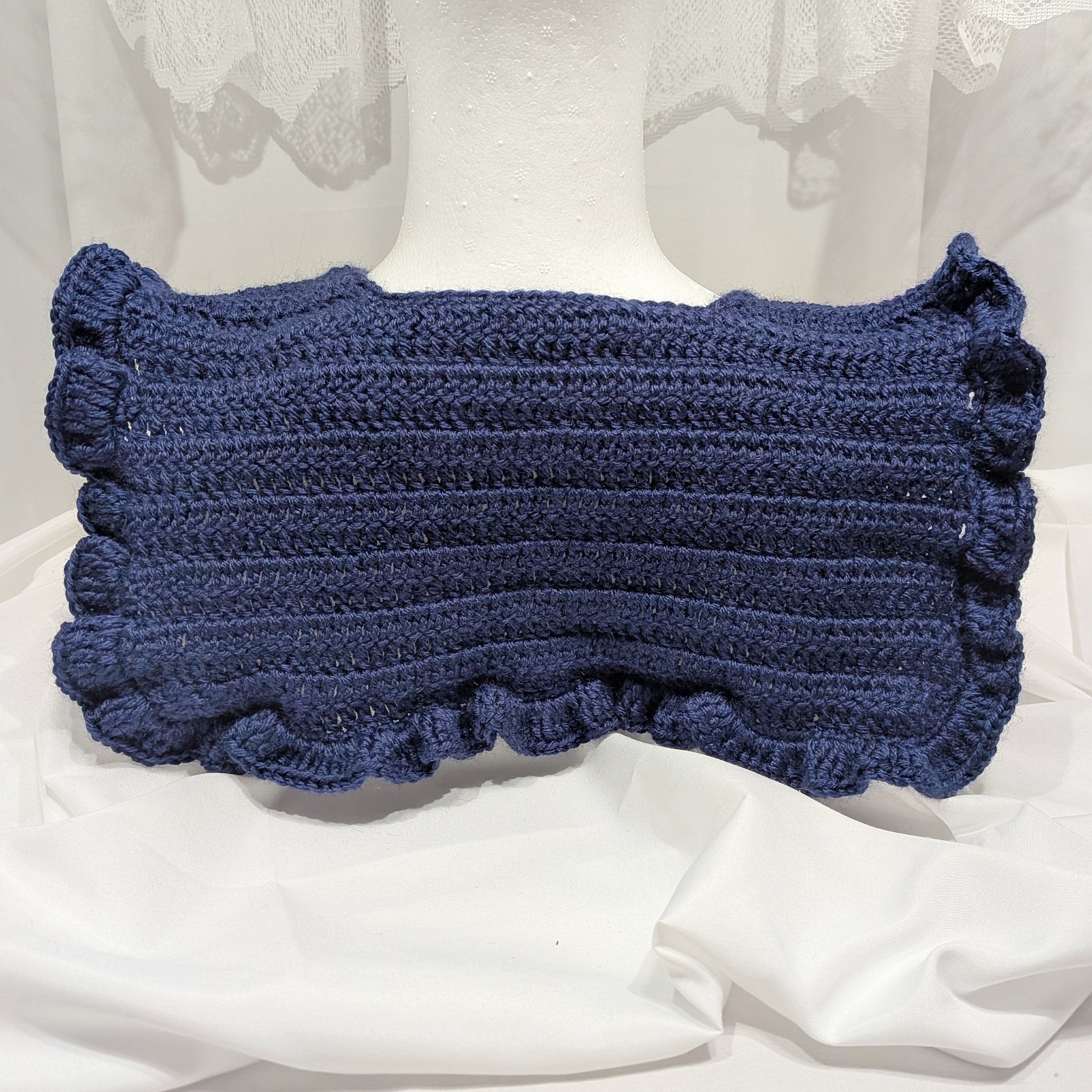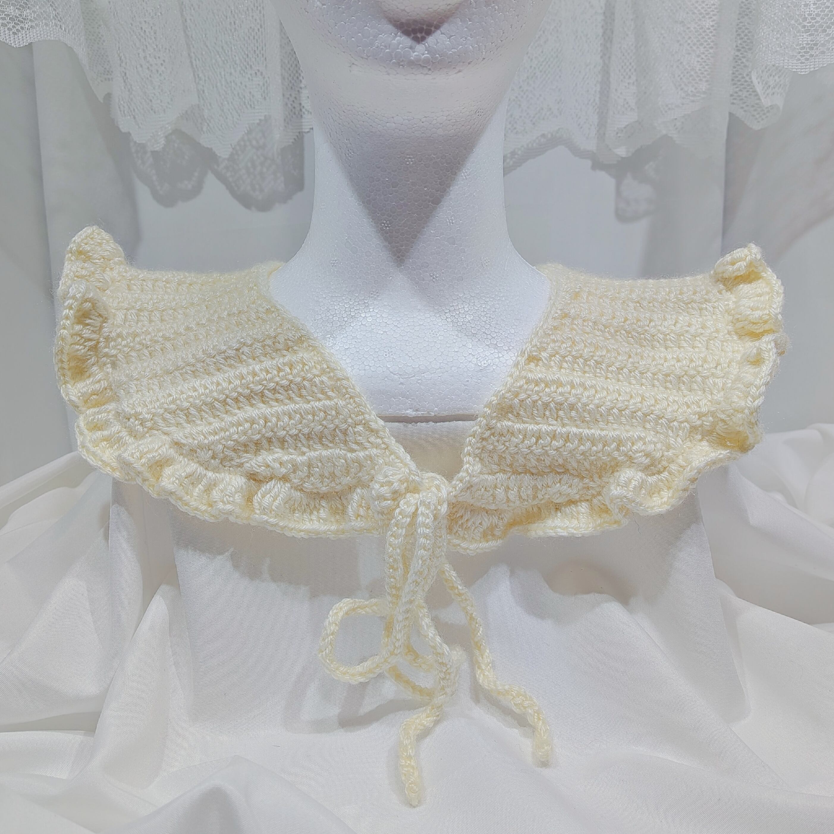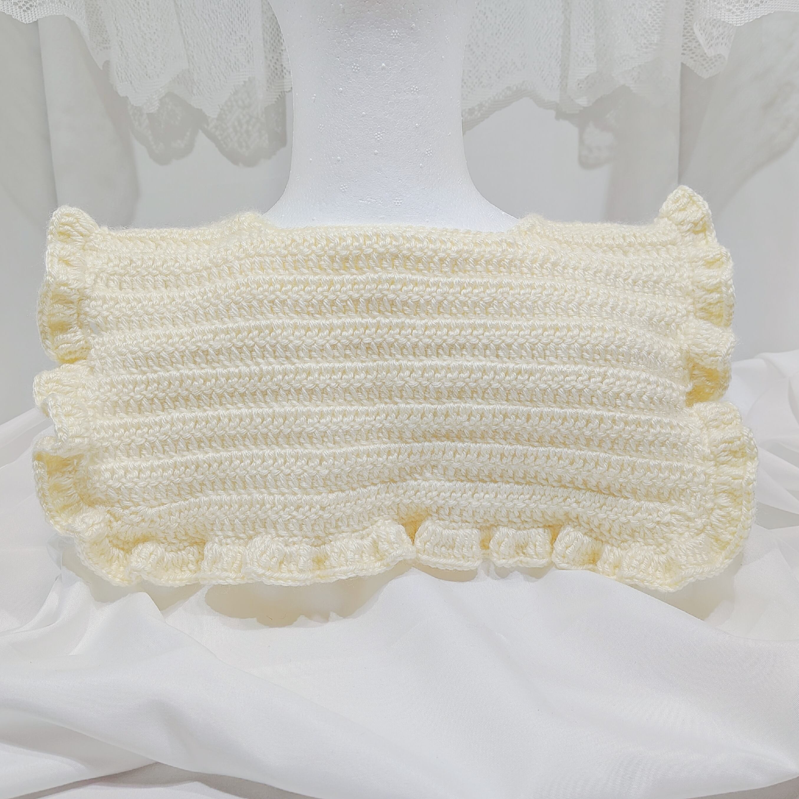 丸みのあるセーラー襟で、フチにはたっぷりのフリルを編みつけました。