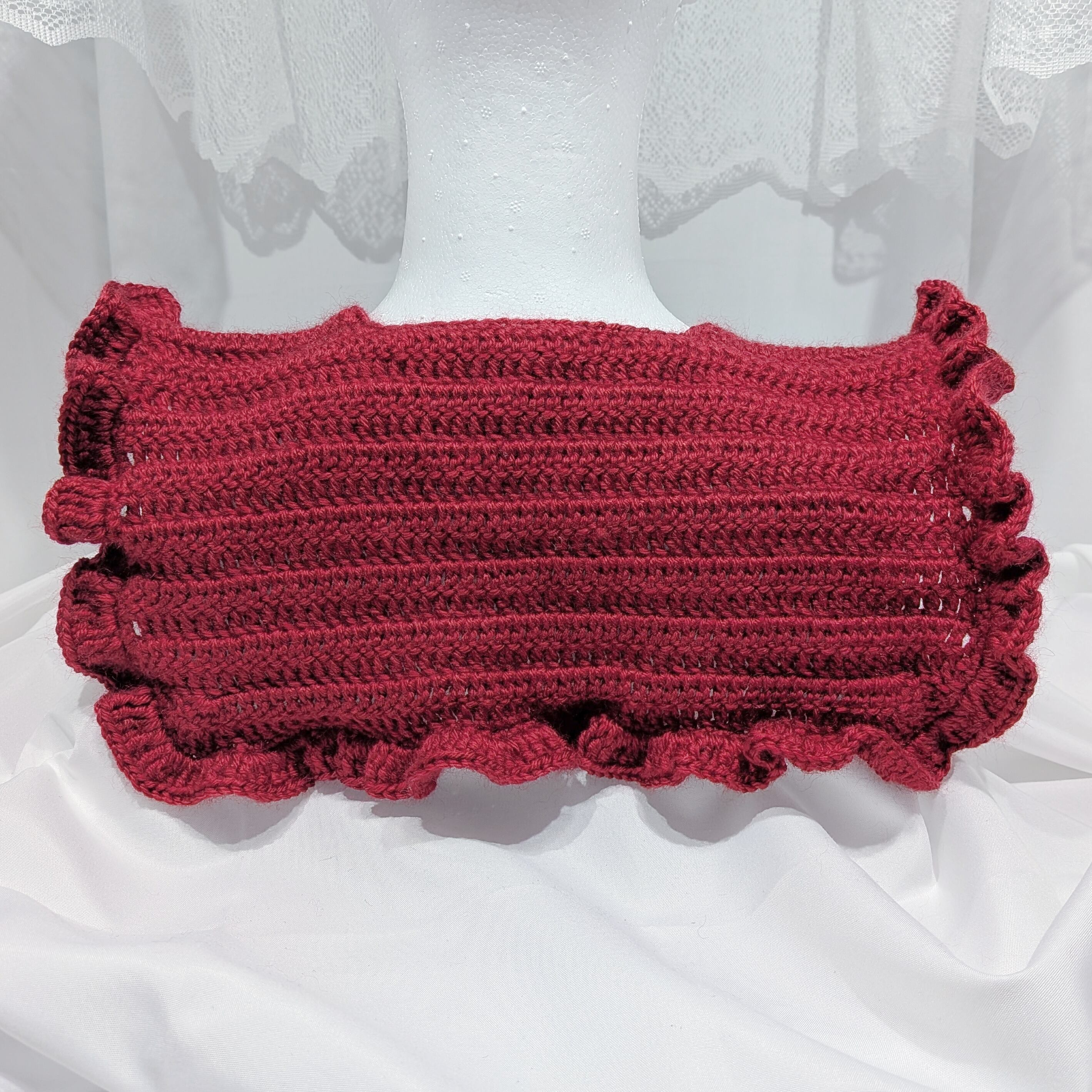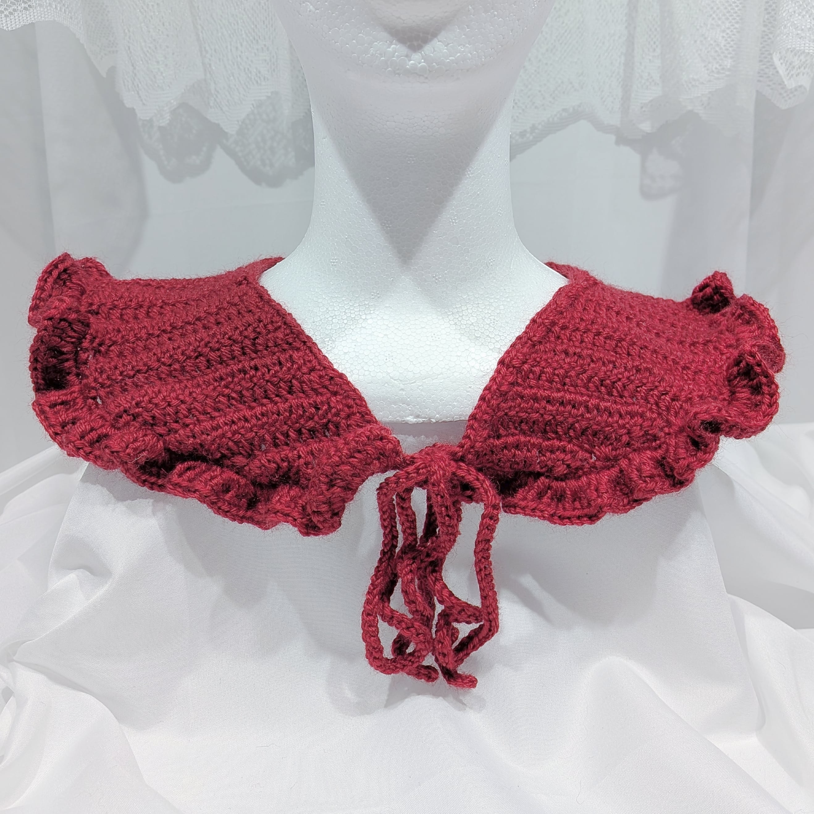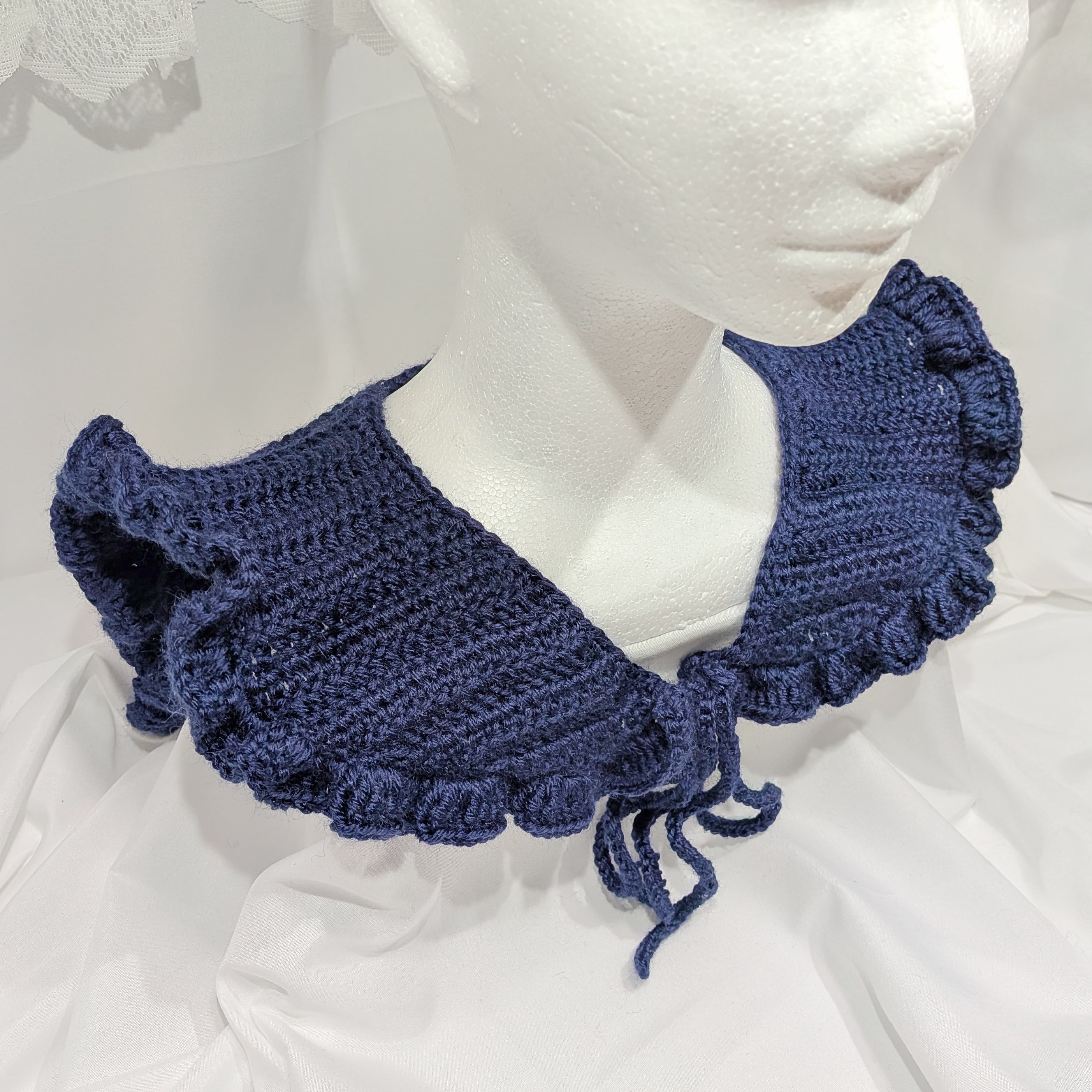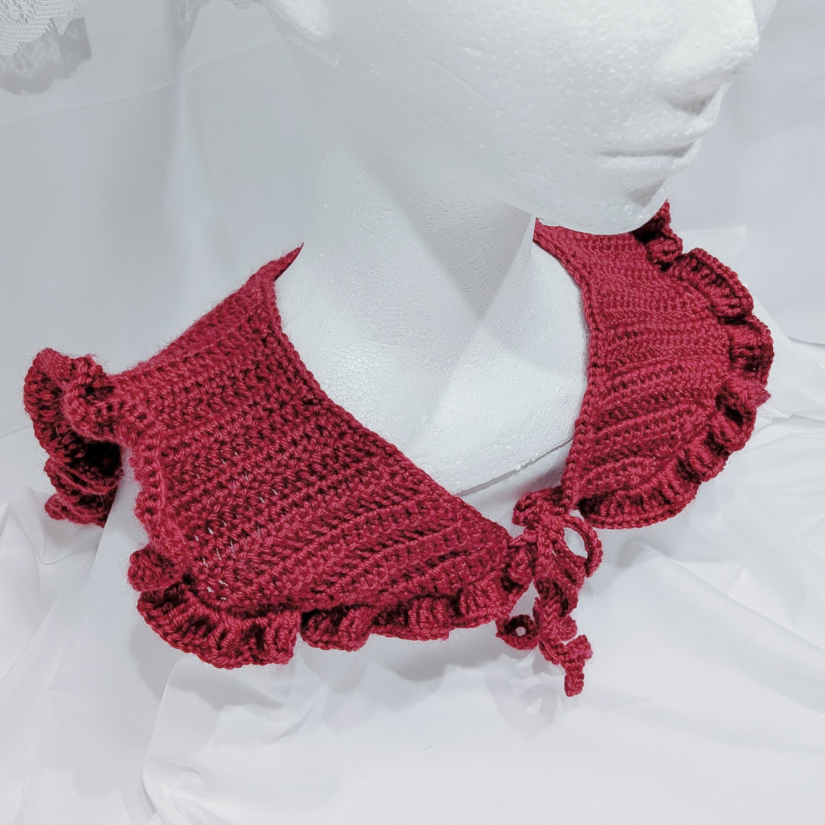 丸みのあるセーラー襟で、フチにはたっぷりのフリルを編みつけました。